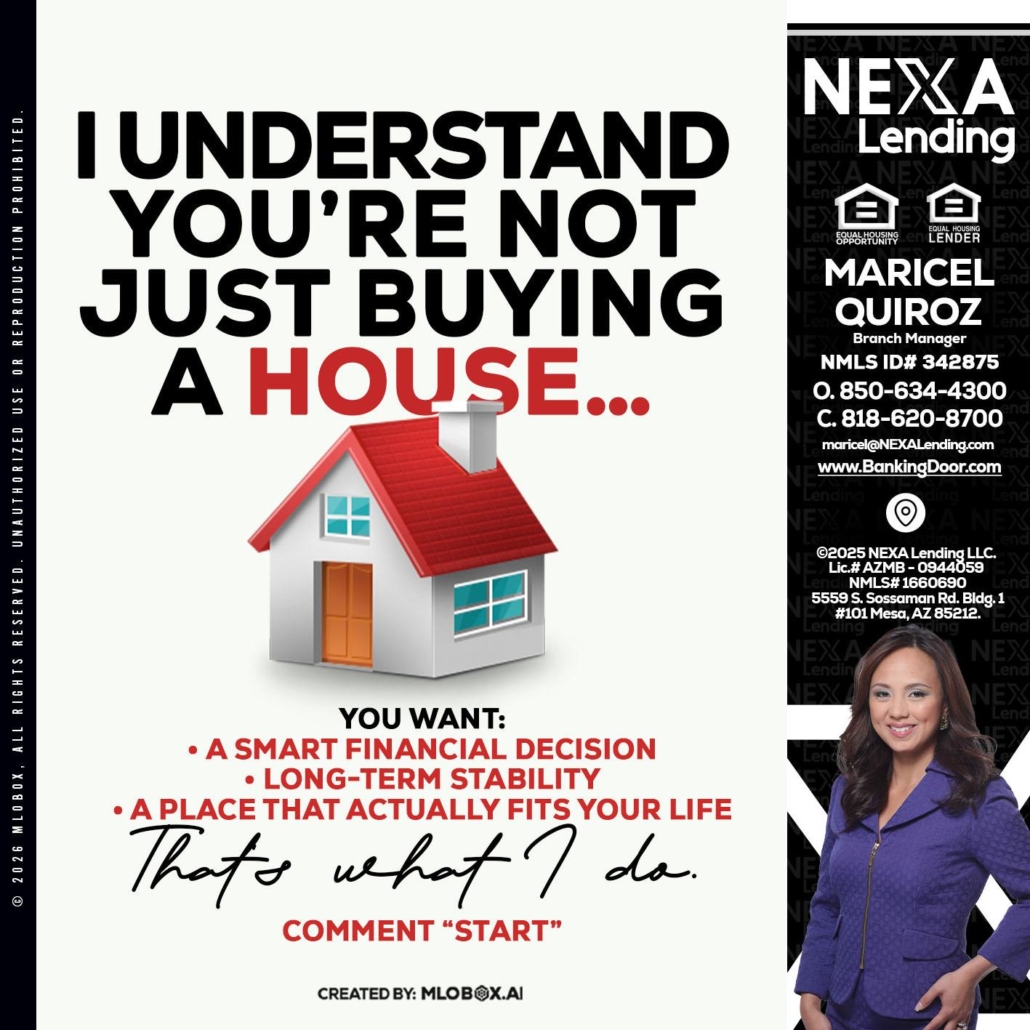 Hi, my name is Maricel Quiroz. I’m a Loan Officer with NEXA Lending LLC., offering personalized mortgage solutions, fast customized quotes, great rates and service with integrity.