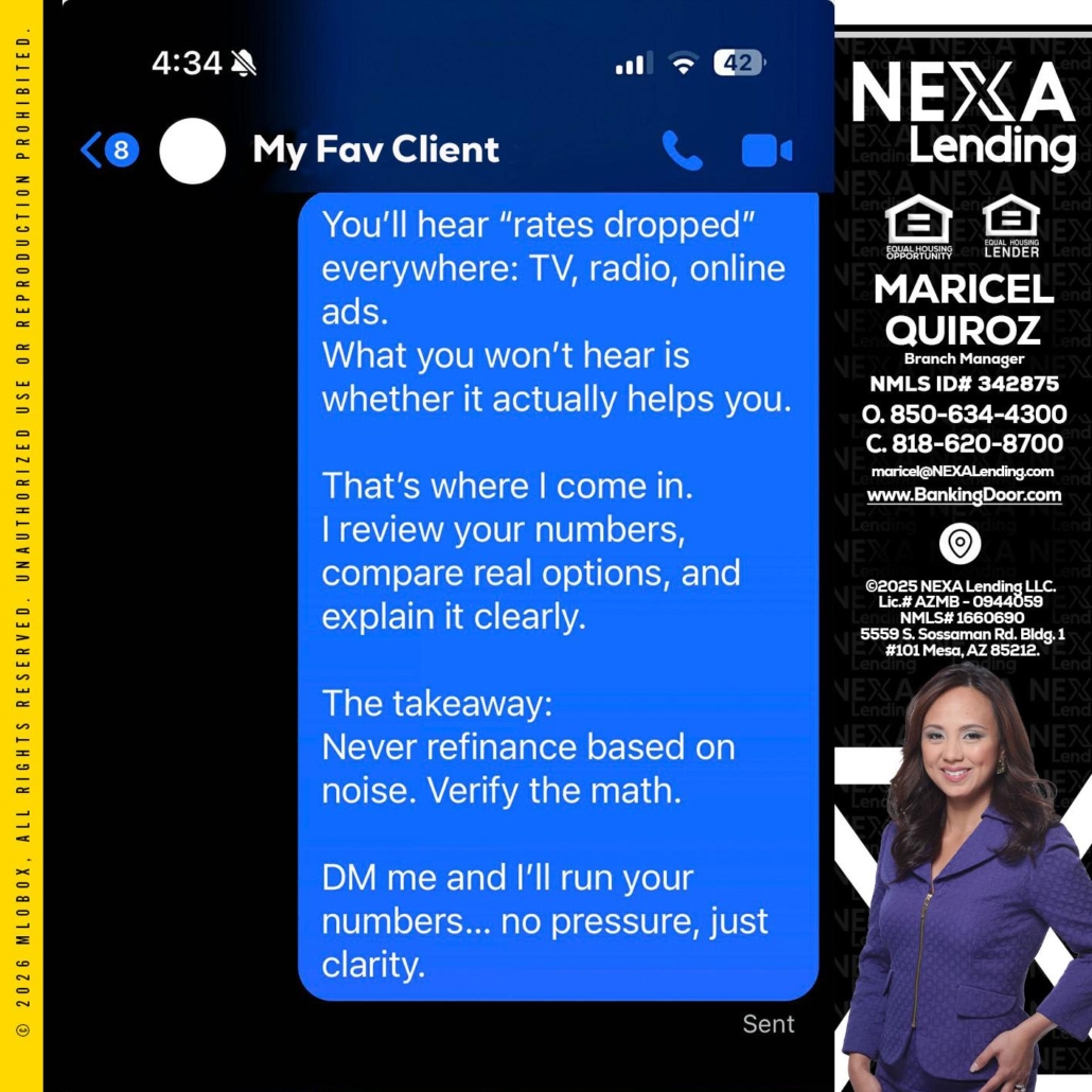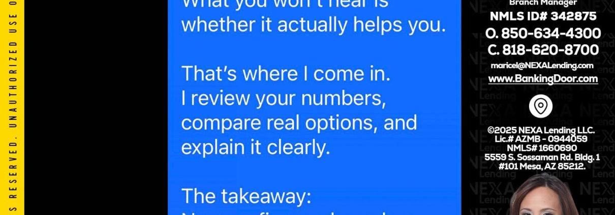 Hi, my name is Maricel Quiroz. I’m a Loan Officer with NEXA Lending LLC., offering personalized mortgage solutions, fast customized quotes, great rates and service with integrity.
