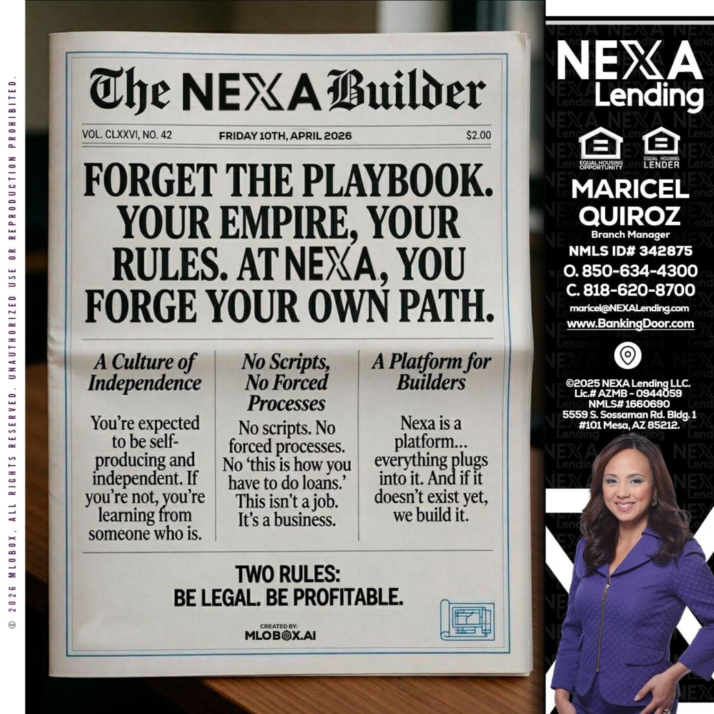 Hi, my name is Maricel Quiroz. I’m a Loan Officer with NEXA Lending LLC., offering personalized mortgage solutions, fast customized quotes, great rates and service with integrity.