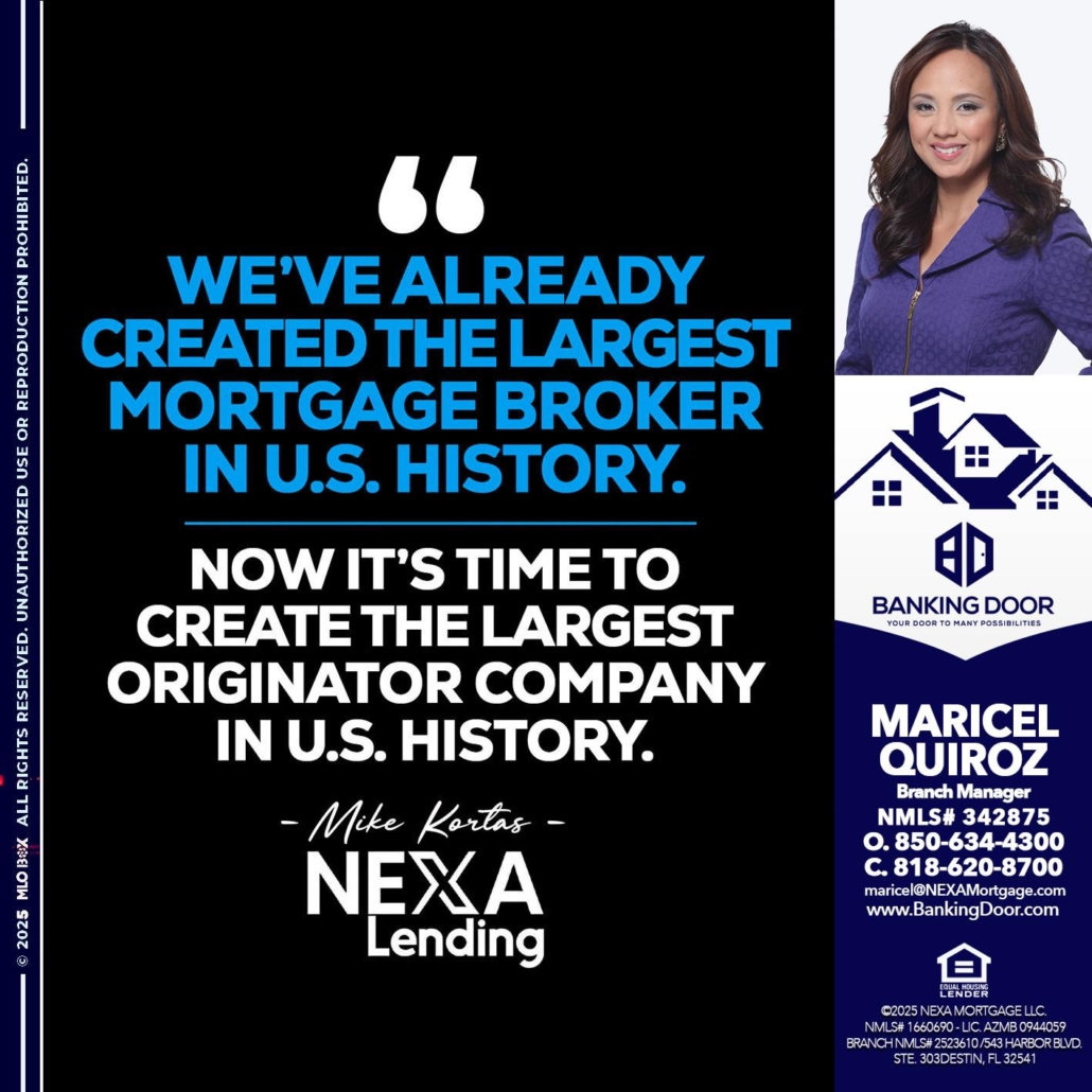 weve already - Maricel Quiroz -Branch ManagerHi, my name is Maricel Quiroz. I’m a Loan Officer with NEXA Mortgage LLC., offering personalized mortgage solutions, fast customized quotes, great rates and service with integrity.